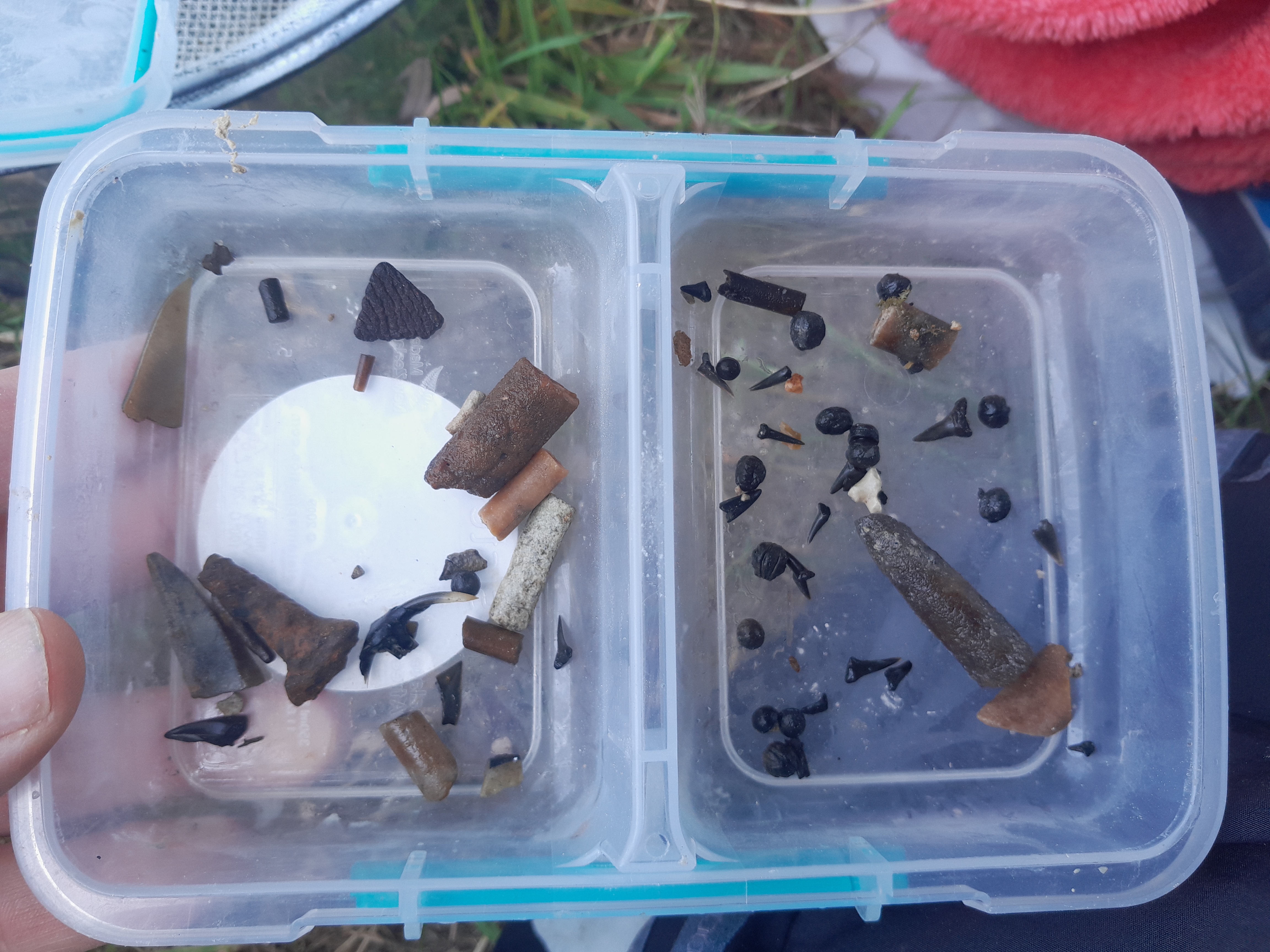 Toen zij er klaar mee was, heb ik nog even snel een hoeveelheid gezeefd om op de camping uit te gaan zoeken. Dat was een goede zet, want daarmee hebben we er nog heel wat meer kunnen vinden.