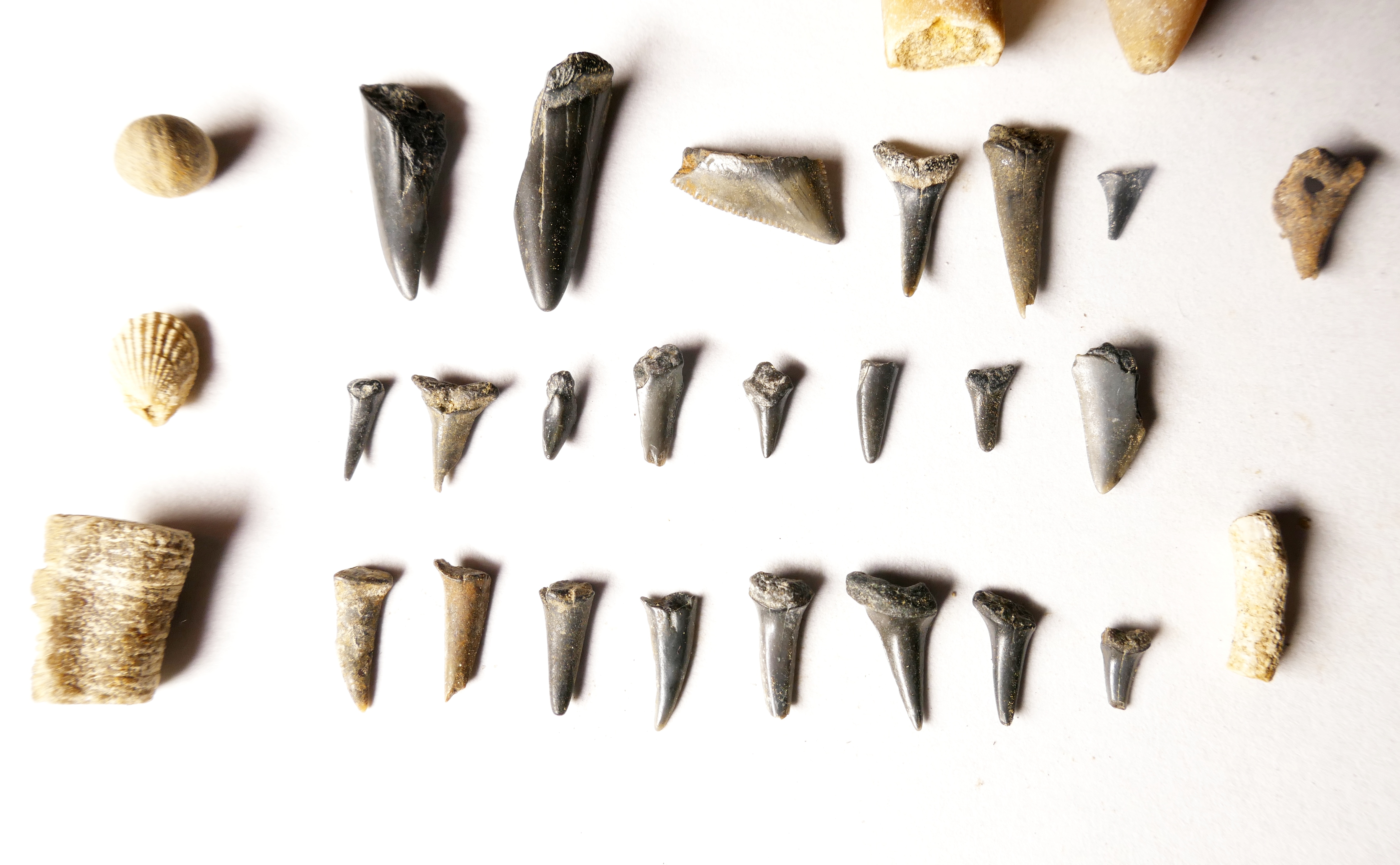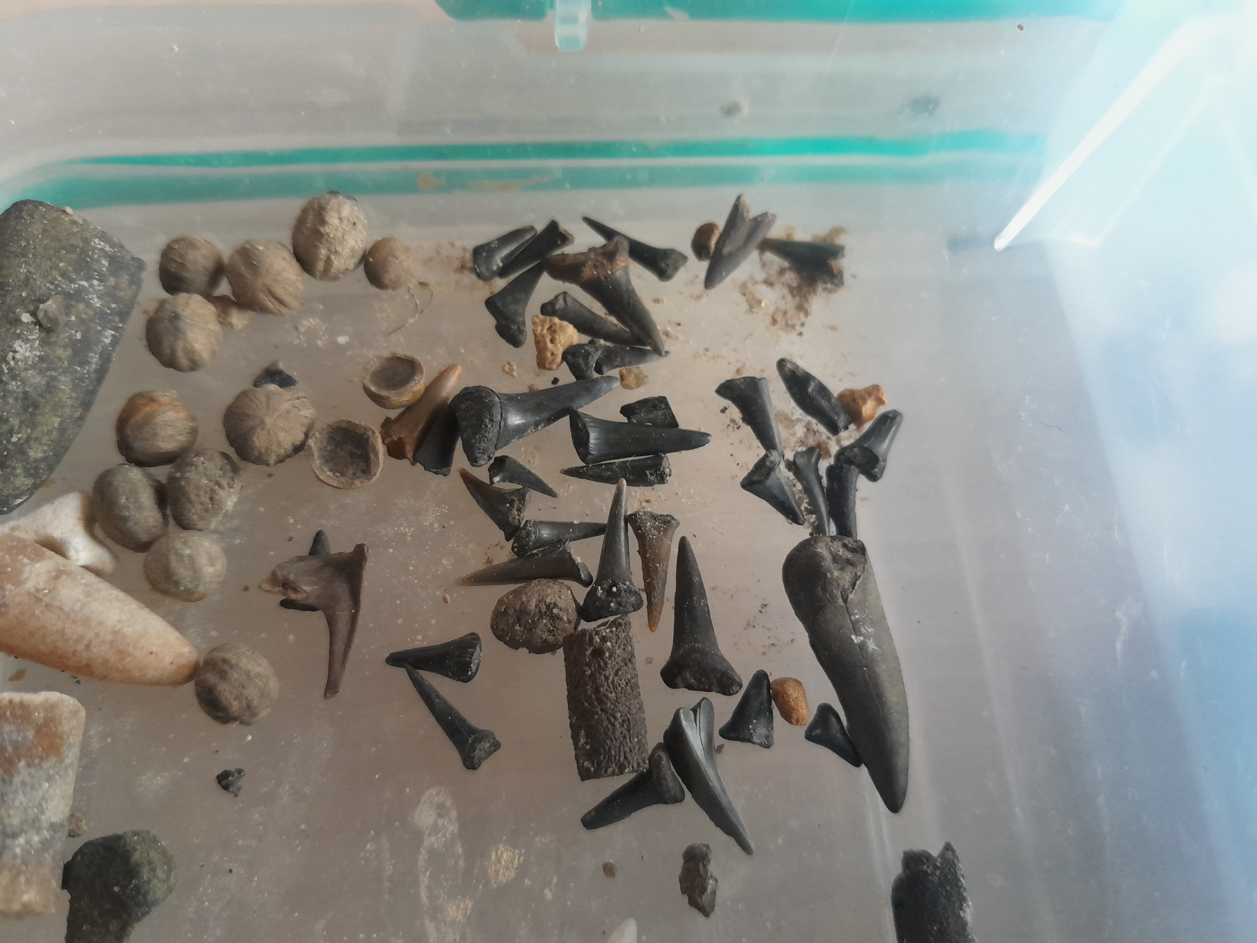 Mijn vangst aan haaientandjes, deels ter plekke gevonden, deels uit het meegenomen gezeefde materiaal. 85 tandjes! Niet slecht voor 4 uurtjes op lokatie zoeken. De tandjes in de Selzerbeek zijn allemaal wel in meer of mindere mate beschadigd. Ik vraag me af hoeveel van de schade voor fossilisatie is opgetreden, en hoeveel door het rondstuiteren in het beekje. Opzich hebben redelijk wat tandjes nog resten van kalk erop, wat doet lijken dat ze niet lang uit het sediment zijn gekomen.