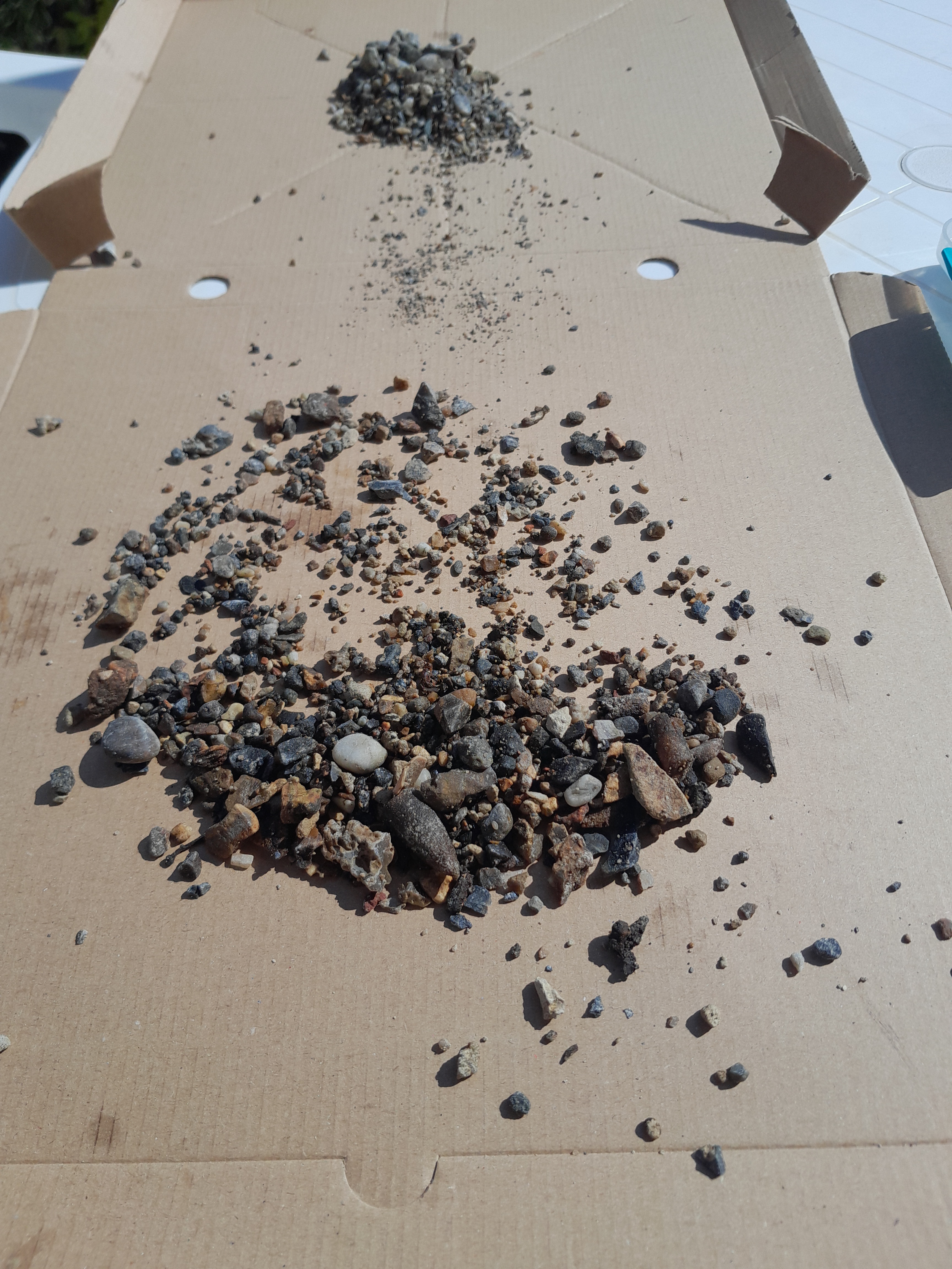 Dit jaar was ik beter voorbereid. Ik had bovenop mijn 3mm zeven een 12mm zeef om de grove stenen er al uit te filteren. En de 3mm zeven had ik wit gespoten. Dat maakte al een wereld van verschil, waardoor de glimmend zwarte tandjes veel beter zichtbaar waren (glimmend zwart op een glimmend zwarte zeef is nauwelijks te zien). En een leesbril hielp ook, want ik wordt ook al een dagje ouder