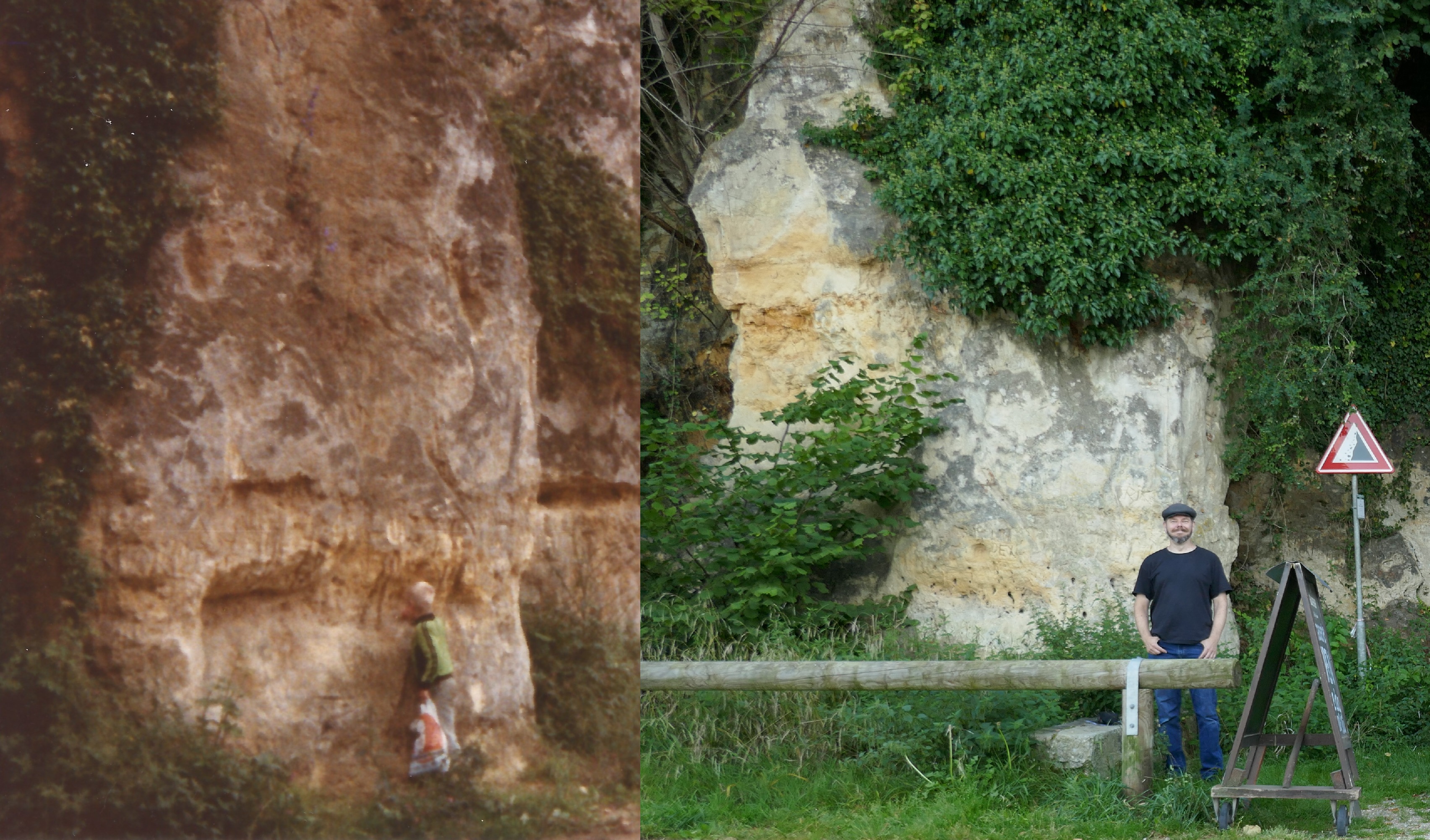 Het was ook niet makkelijk te herkennen, aangezien er veel is veranderd in 40 jaar. De mergel wand is ook flink veranderd, en dat waarschuwingsbordje rechts achter me staat er niet voor niets. Daar nu zoeken is dus ook absoluut niet meer mogelijk, te meer om dat die wand erg instabiel is, en ook dat stuk waar ik sta waarschijnlijk niet heel lang meer zal bestaan. Maar in ieder geval fijn om hier nog even bij stil te hebben kunnen staan.