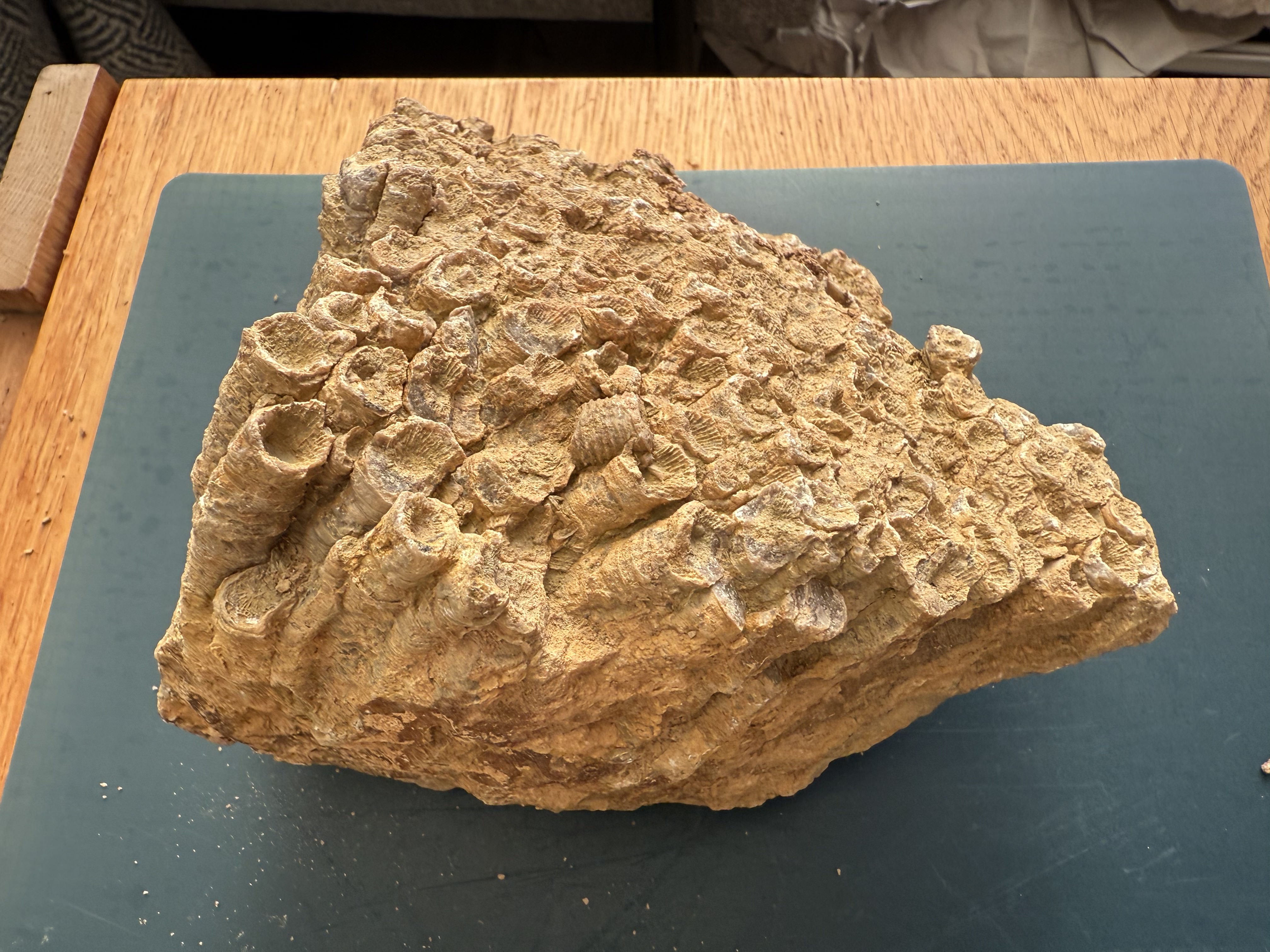 Mooie cluster rugosa. Is dat centraal in het blok op de eerste foto een (fragment) trilobiet?