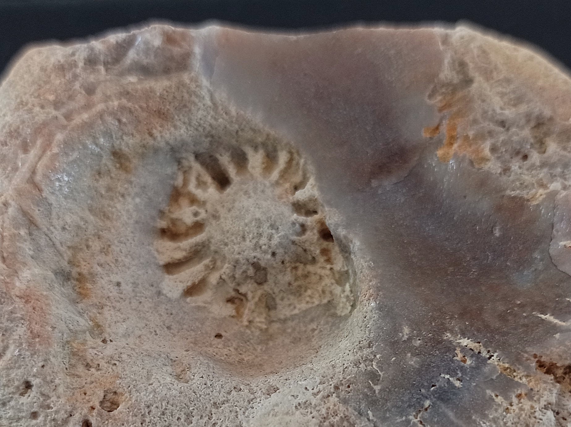 Echter, het sponslichaam moest andersom georiënteerd worden. De vermeende bovenkant bleek bij nader inzien de onderzijde van de spons. Met behulp van een loep kon een sterretjesskelet worden herkend, waaruit we de conclusie trokken dat de Aulocopium ooit is begonnen te groeien op de resten van een sferoclonellide spons, een spons met een 'sterretjes'-skelet! De insnijdingen van de laatste zijn nog duidelijk als negatief te herkennen.