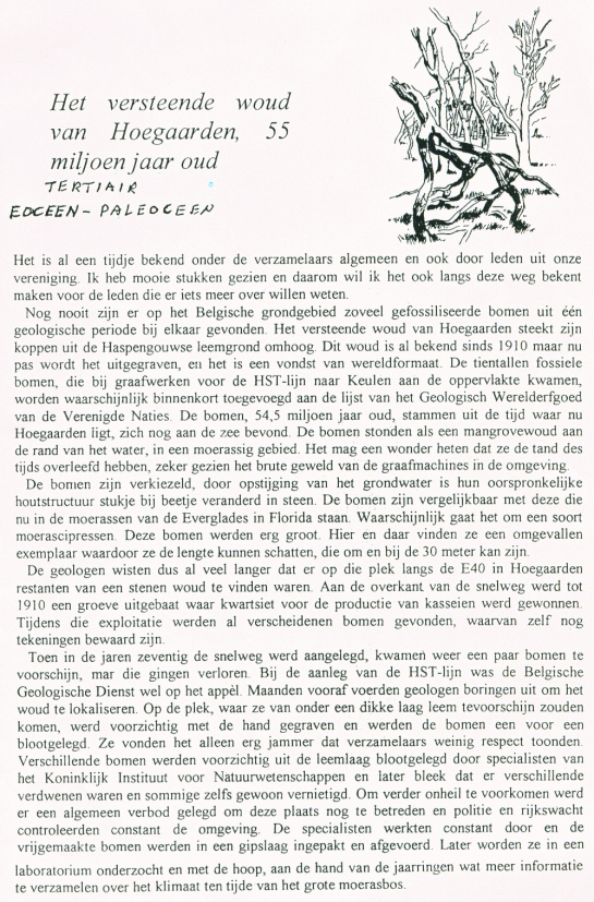 Ik ben op zoek naar informatie in verband met het meest voorkomende versteend hout dat terug te vinden is in de zandlagen in Vlaanderen (West-Vlaanderen, eventueel ook over versteend hout te Hoegaarden, etc). Van wat voor bomen komen ze meestal? Hoe herken je welke soort? Uit welke tijd komen ze? Oligoceen? Een stuk minder oud? ... Bij niet-wetenschappelijke publicaties kwam ik dubbelzinnigheden tegen en heel verschillende schattingen qua leeftijd. Als iemand iemand kent die hierbij kan helpen, zou dat worden geapprecieerd.